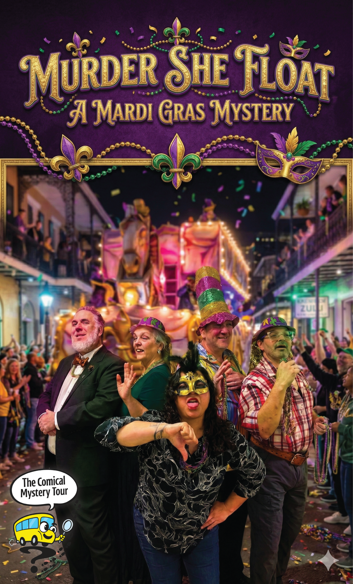 Mardi Gras is supposed to be a lot of fun after a lot of hard work, or before a lot of hard work, or during a lot of hard work. The Krewe Du Wild Chalupas are holding a Krewe party to choose a queen to ride on their float. One of the contestants doesn't make it to the parade as someone decides she doesn't deserve it. Could it be Maude E Graw? How about Matty Door? Maybe Jim Teacher or Dick C Lee. Who knows? Hopefully you will. Come along for the ride and help figure it out and have a lot of laughs.
